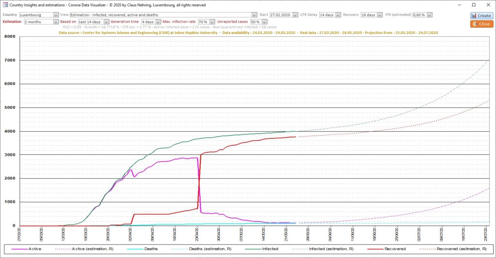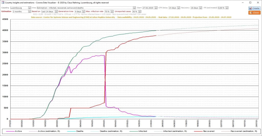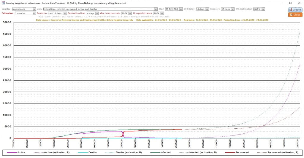 Ich benutze für die Erstellung der Szenarien ein sehr einfaches und nachvollziehbares Modell. Die Basis stellen die durchschnittliche Reproduktionszahl und die durchschnittliche Fallsterblichkeit der letzten 14 Tage dar. Für den 24. Mai 2020 ist die Reproduktionszahl 0,99 und die daraus errechnete Zuwachsrate 18,7718 %, die Fallsterblichkeit beträgt 2,77 %. Außerdem benutze ich die offiziellen Zahlen der luxemburgischen Regierung zur Anzahl der zum Stichtag aktiven Fälle, im Beispiel sind das 115 aktiv Infizierte.